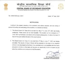 नई दिल्ली । केंद्रीय माध्यमिक शिक्षा बोर्ड सीबीएसई द्वारा दसवीं की परीक्षाएं रद्द कर दी गई है साथ 12वीं की परीक्षा को स्थगित कर दिया गया है 12वीं की परीक्षा की तिथि बाद में घोषित की जाएगी परीक्षा के 15 दिन पहले छात्रों को परीक्षा तिथि के संबंध में सूचना दी जाएगी .12वीं के परीक्षा के लिए 1 जून को रिव्यू मीटिंग की जाएगी जिसके बाद तिथि की घोषणा की जाएगी ज्ञात हो कि प्रधानमंत्री नरेंद्र मोदी ने आज शिक्षा मंत्री रमेश पोखरियाल निशंक और शिक्षा विभाग के अन्य अधिकारियों के साथ बैठक की थी जिसमें पहले से ही कयास लगाए जा रहे थे कि बोर्ड परीक्षा रद्द हो सकती है अभी भी शिक्षा मंत्री की शिक्षा विभाग और सीबीएसई के अधिकारियों के साथ बैठक चल रही है जिसमें आगे की गाइडलाइन जारी की जाएगी