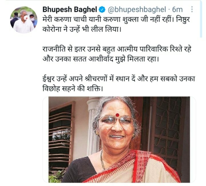 मुख्यमंत्री भूपेश बघेल ने ट्वीट करके करुणा शुक्ला के निधन पर शोक जताया