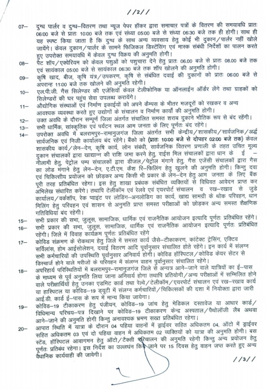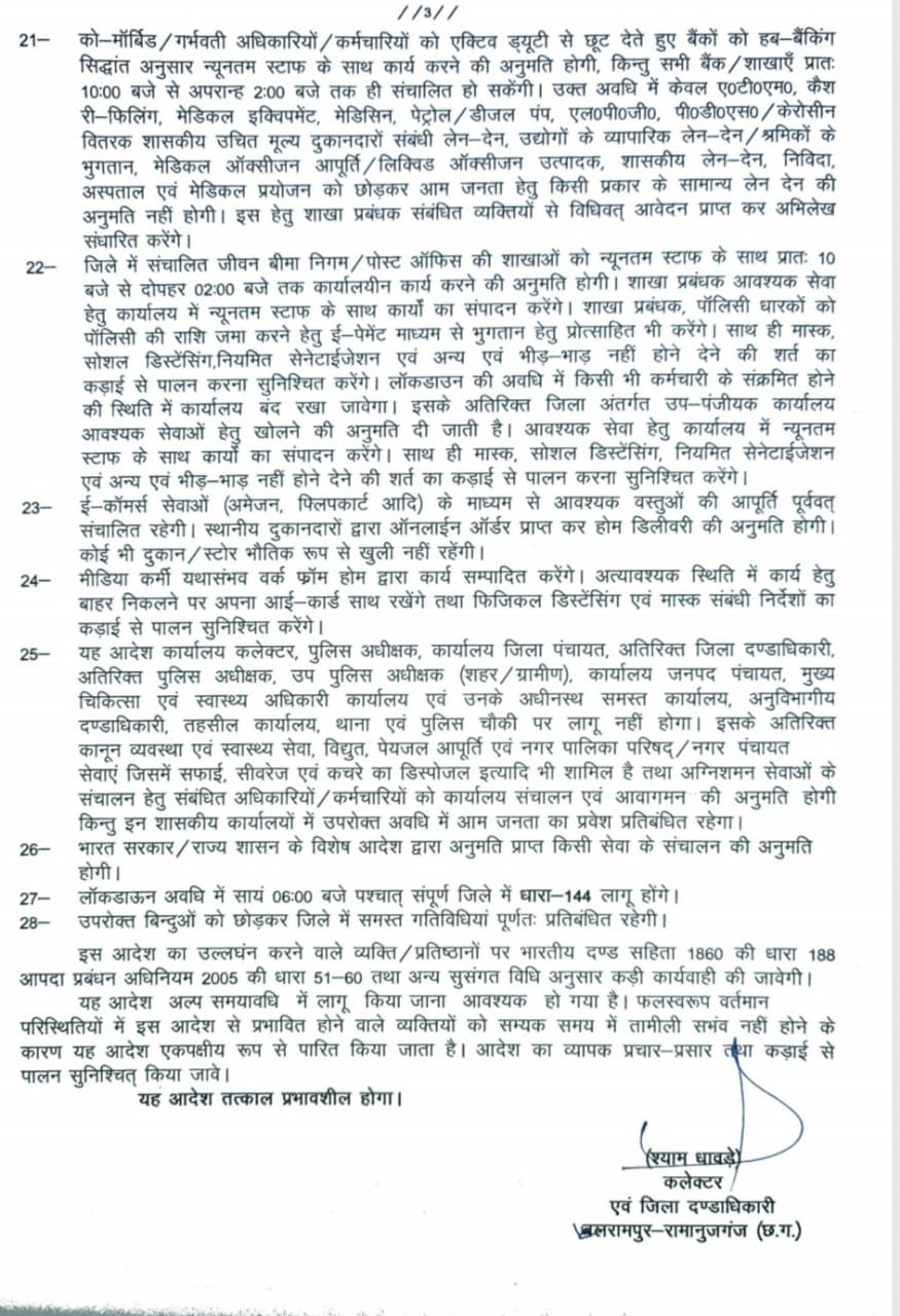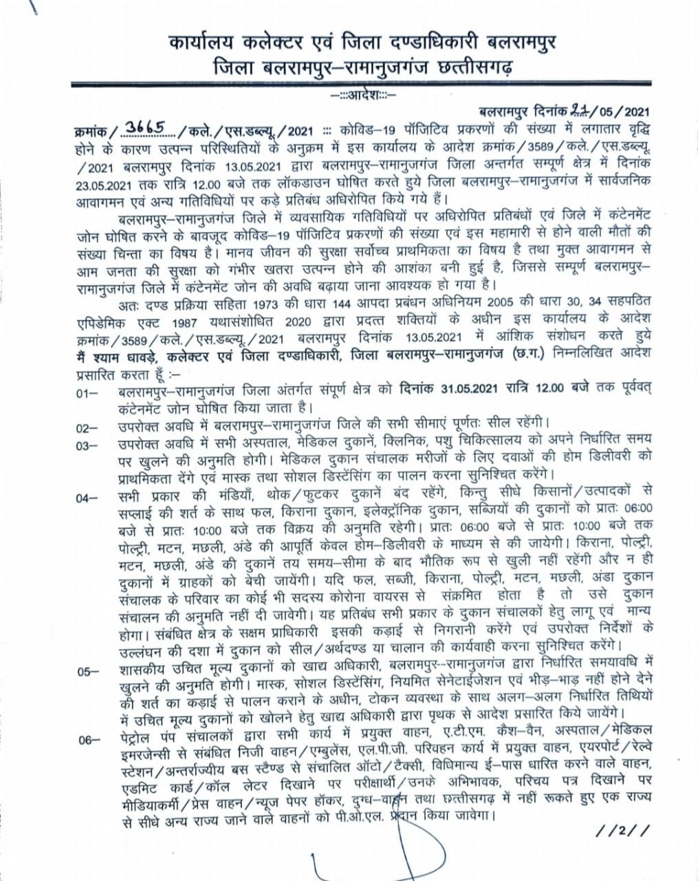 बलरामपुर जिले में बढ़ाया गया लॉकडाउन, कलेक्टर श्याम धावडे ने जारी किए आदेश, देखिए किन किन चीजों में मिली है छूट।