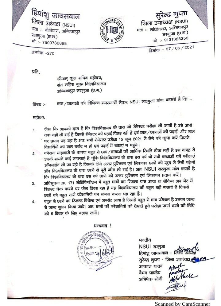 संत गहिरा गुरु विश्वविद्यालय में फॉर्म भरने की तिथि अब 15 जून तक …अधिसूचना 171 के अनुसार पास छात्रों को भी नेट पर अनुउतीर्ण दिखाने सहित अन्य समस्याओं को लेकर सरगुजा NSUI ने कुलसचिव को सौंपा ज्ञापन
