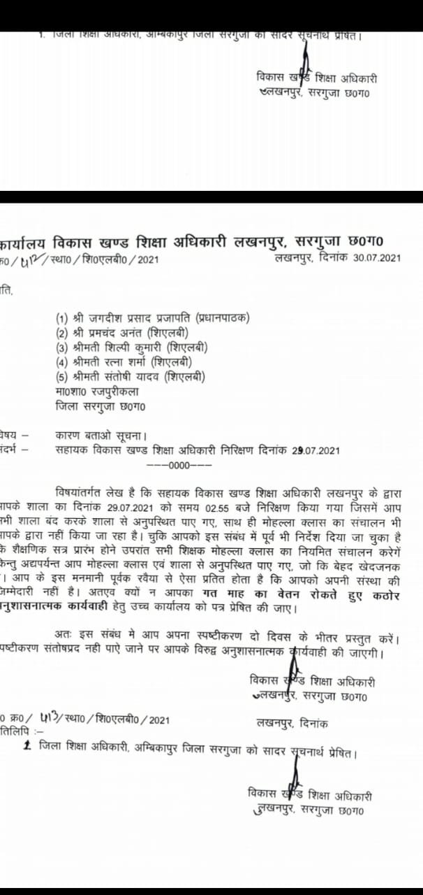 लखनपुर शिक्षा विभाग की एक बड़ी लापरवाही सामने आई है 14 माह पूर्व सेवानिवृत्त हुए प्रधान पाठक को अवैतनिक कर स्पष्टीकरण का नोटिस जारी किया गया जो आज क्षेत्र में चर्चा का विषय बना हुआ है। विगत दिनों पूर्व सहायक खंड शिक्षा अधिकारी रविकांत यादव के द्वारा विकासखंड के लहपटरा, धनपुरी रजपुरी कला स्कूलों का निरीक्षण किया गया था निरीक्षण उपरांत स्कूल तथा महोल्ला क्लास का संचालन बंद पाया गया। 29 जुलाई को खंड शिक्षा अधिकारी सूरज प्रताप सिंह ने बंद मिले स्कूलों के प्रधान पाठकों तथा शिक्षकों को अवैतनिक कर स्पष्टीकरण का का नोटिस जारी करते हुए दो दिवस के भीतर जवाब प्रस्तुत करने कहा गया। इसी कड़ी में लखनपुर विकासखंड अंतर्गत ग्राम रजपुरी कला के शासकीय माध्यमिक पाठशाला में पदस्थ प्रधान पाठक जगदीश प्रसाद प्रजापति जो 14 माह पूर्व सेवानिवृत्त हो गए हैं उन्हें लखनपुर खंड शिक्षा अधिकारी के द्वारा अवैतनिक कर स्पष्टीकरण का नोटिस जारी करते हुए दो दिवस के भीतर जवाब प्रस्तुत करने को कहा गया था। इससे पूर्व में भी खंड शिक्षा अधिकारी सूरज प्रताप सिंह के द्वारा मौका जांच किए बिना आइसोलेशन सेंटर कोविड सेंटर में ड्यूटी पर तैनात शिक्षकों को स्पष्टीकरण का नोटिस जारी किया गया था।