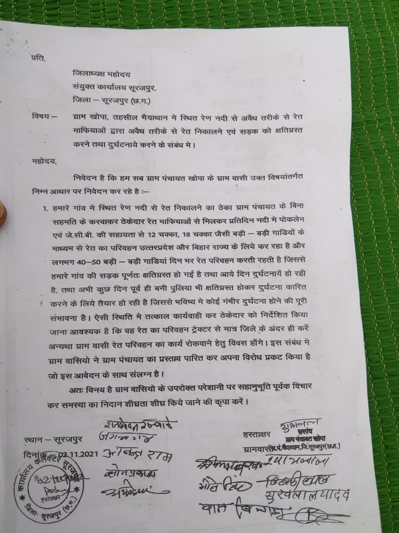 ग्राम वासियों के द्वारा कलेक्टर सूरजपुर को दो बार आवेदन दिया गया परंतु उसमें कलेक्टर महोदय द्वारा कोई सुनवाई नहीं किया गया