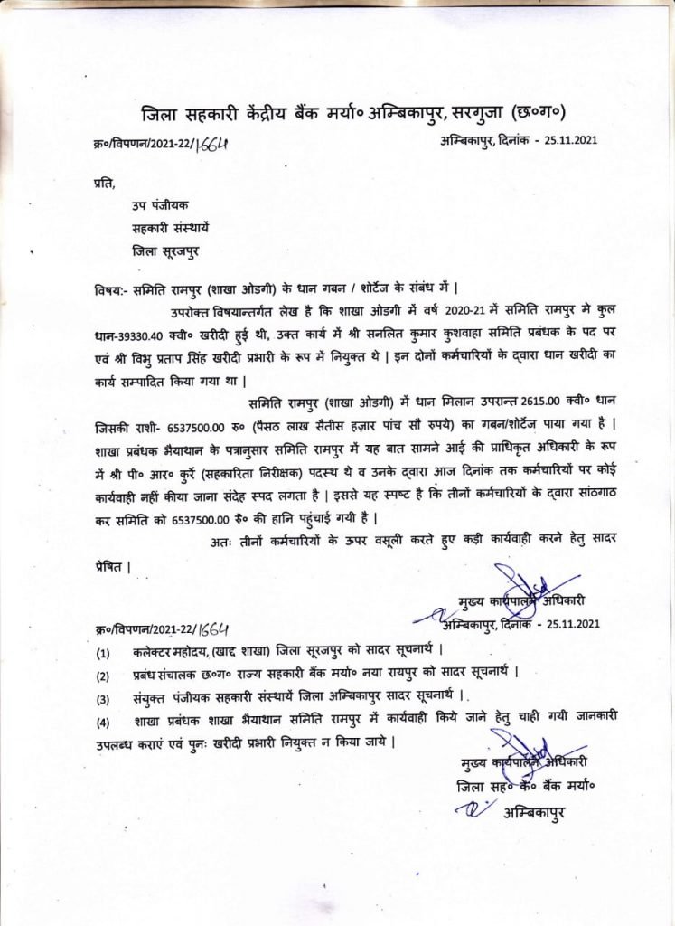 इस संबंध में जिला सहकारी केंद्रीय बैंक के मुख्यकार्यपालन अधिकारी सुनील सोढ़ी ने बताया कि वर्ष 2020-21 में रामपुर खरीदी केंद्र में धान शार्टेज पाया गया है जिसमे समिति प्रबंधक सहित दो अन्य पर कार्यवाही करने हेतु उप पंजीयक अधिकारी सूरजपुर को पत्र भेजा गया है इन पर कार्यवाही करने का अधिकार उप पंजीयक अधिकारी का है।