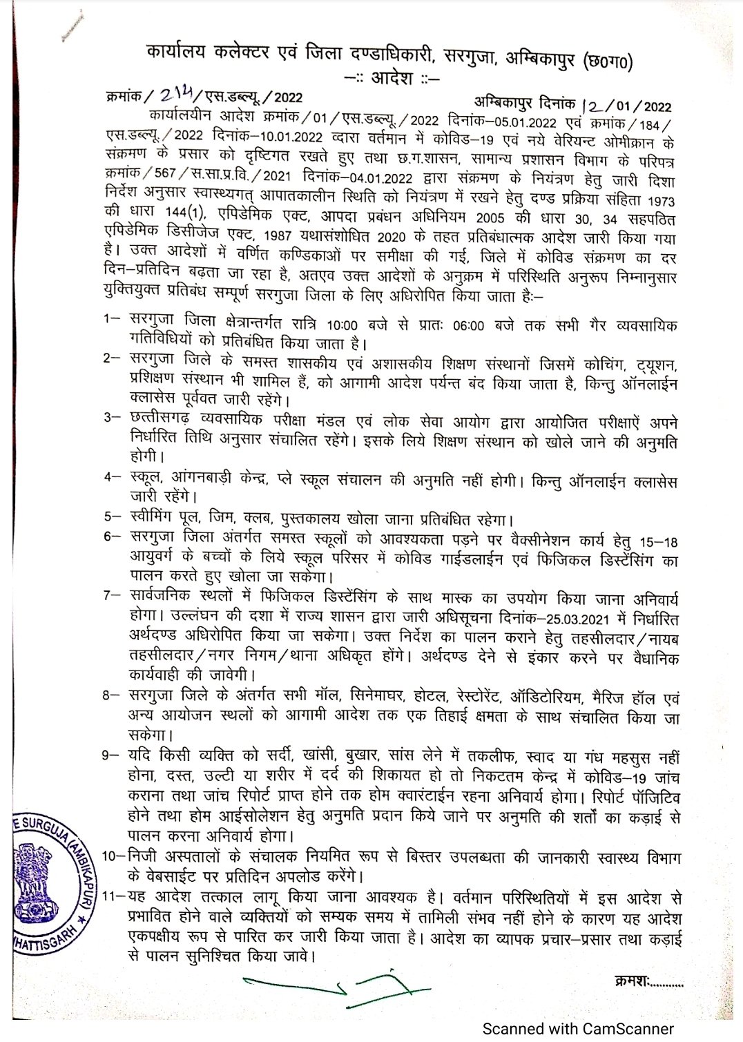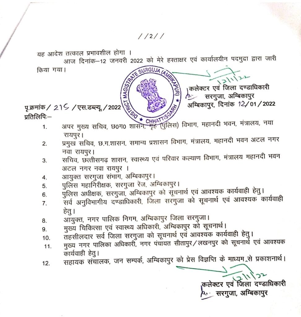 अम्बिकापुर कलेक्टर एवं जिला दण्डाधिकारी सरगुजा द्वारा वर्तमान में कोविड-19 एवं नए वेरिएंट ओमिक्रॉन के संक्रमण के प्रसार को दृष्टिगत रखते हुए तथा सरगुजा जिले में कोरोना वायरस संक्रमण दर 4 प्रतिशत से अधिक पाए जाने के फलस्वरूप छत्तीसगढ़ शासन के सामान्य प्रशासन विभाग के परिपत्र में जारी दिशा-निर्देश के अनुसार स्वास्थ्यगत आपातकालीन स्थिति के नियंत्रण हेतु एपिडेमिक डिसीजेज एक्ट के तहत प्रतिबंधात्मक आदेश जारी किया गया है।