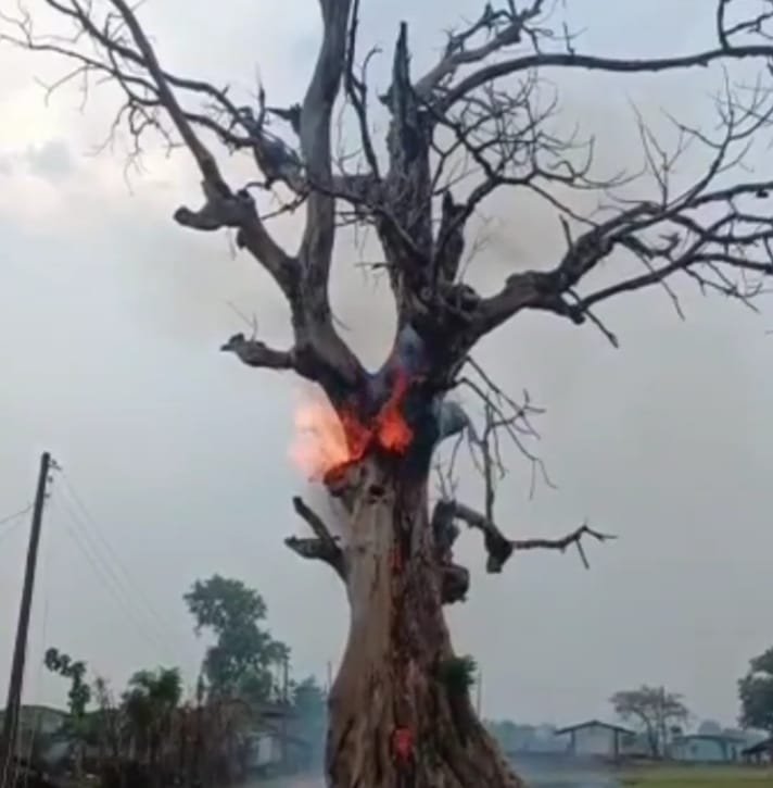 आकाशीय बिजली गिरने से पेड़ में लगी आग