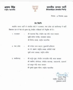 भाजपा संसदीय बोर्ड ने किया छत्तीसगढ़ में मुख्यमंत्री चुनने के लिए पर्यवेक्षक दल की नियुक्ति