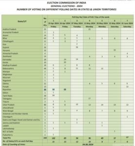 लोकसभा चुनाव 2024 का ऐलान सात चरणों में कराए जाएंगे मतदान 4 जून को नतीजे 19 अप्रैल को पहले चरण के लिए मतदान, 26 अप्रैल को दूसरे चरण की वोटिंग , तीसर फेस 7 मई को मतदान ,चौथे चरण में 13 मई ,पांचवा चरण 20 मई छठवां चरण 25 मई , सातवां और अंतिम चरण का मतदान 1 जून को होगा