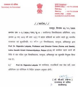 रायपुर। इंदिरा गांधी कृषि विश्वविद्यालय, रायपुर (छ.ग.) के प्रोफेसर और निदेशक फार्म्स (फार्म्स एंड सीड्स), प्रो. डॉ. राजेंद्र लखपाले को संत गहिरा गुरु विश्वविद्यालय, सरगुजा, अंबिकापुर का नया कुलपति (Vice Chancellor) नियुक्त किया गया है।