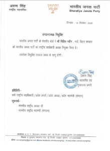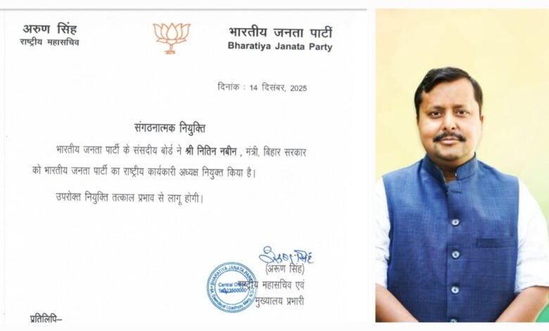 इस संबंध में पार्टी की ओर से औपचारिक संगठनात्मक आदेश जारी किया गया है। आदेश के अनुसार, यह नियुक्ति भारतीय जनता पार्टी के संसदीय बोर्ड द्वारा की गई है। आदेश पर बीजेपी के राष्ट्रीय महासचिव एवं मुख्यालय प्रभारी अरुण सिंह के हस्ताक्षर हैं। आदेश में स्पष्ट किया गया है कि नितिन नबीन, जो वर्तमान में बिहार सरकार में मंत्री हैं, अब राष्ट्रीय स्तर पर संगठन की महत्वपूर्ण जिम्मेदारी संभालेंगे।