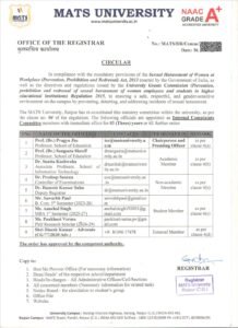रायपुर: MATS यूनिवर्सिटी, रायपुर ने UGC रेगुलेशन २०२५ के क्लॉज़ 4(d) के अनुसार एडवोकेट दिनेश कुमार साहू को अपनी इंटरनल कंप्लेंट्स कमेटी (ICC) का बाह्य सदस्य नियुक्त किया है। उनकी नियुक्ति तीन साल के कार्यकाल के लिए की गई है। यह समिति भारत सरकार द्वारा बनाए गए कार्यस्थल पर महिलाओं के यौन उत्पीड़न (रोकथाम, निषेध और निवारण) अधिनियम, 2013 के अनिवार्य प्रावधानों के अनुपालन एवं यूनिवर्सिटी ग्रांट्स कमीशन (उच्च शिक्षण संस्थानों में महिला कर्मचारियों और छात्राओं के यौन उत्पीड़न की रोकथाम, निषेध और निवारण) विनियम, 2015 के निर्देशानुसार, एक वैधानिक ढांचे के रूप में उच्च शिक्षण संस्थानों को परिसर में महिलाओं के लिए सुरक्षा, गरिमा और समानता सुनिश्चित करने के लिए मजबूत, निष्पक्ष और सुलभ शिकायत निवारण प्रणाली स्थापित करने की आवश्यकता पर बल देता है।