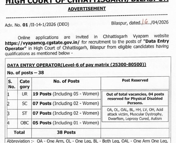 बिलासपुर: छत्तीसगढ़ उच्च न्यायालय, बिलासपुर ने डेटा एंट्री ऑपरेटर के रिक्त पदों को भरने के लिए विज्ञापन जारी किया है। इस भर्ती प्रक्रिया के तहत कुल 38 पदों पर नियुक्तियां की जाएंगी, जिसके लिए छत्तीसगढ़ व्यावसायिक परीक्षा मंडल (व्यापमं) की आधिकारिक वेबसाइट पर ऑनलाइन आवेदन आमंत्रित किए गए हैं।
